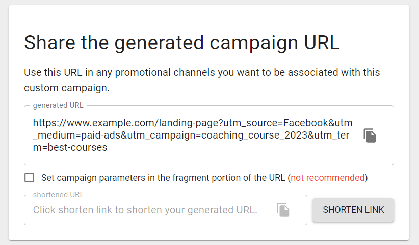 Når du har indtastet disse oplysninger, vil værktøjet automatisk generere en tilpasset URL med UTM-parametre: