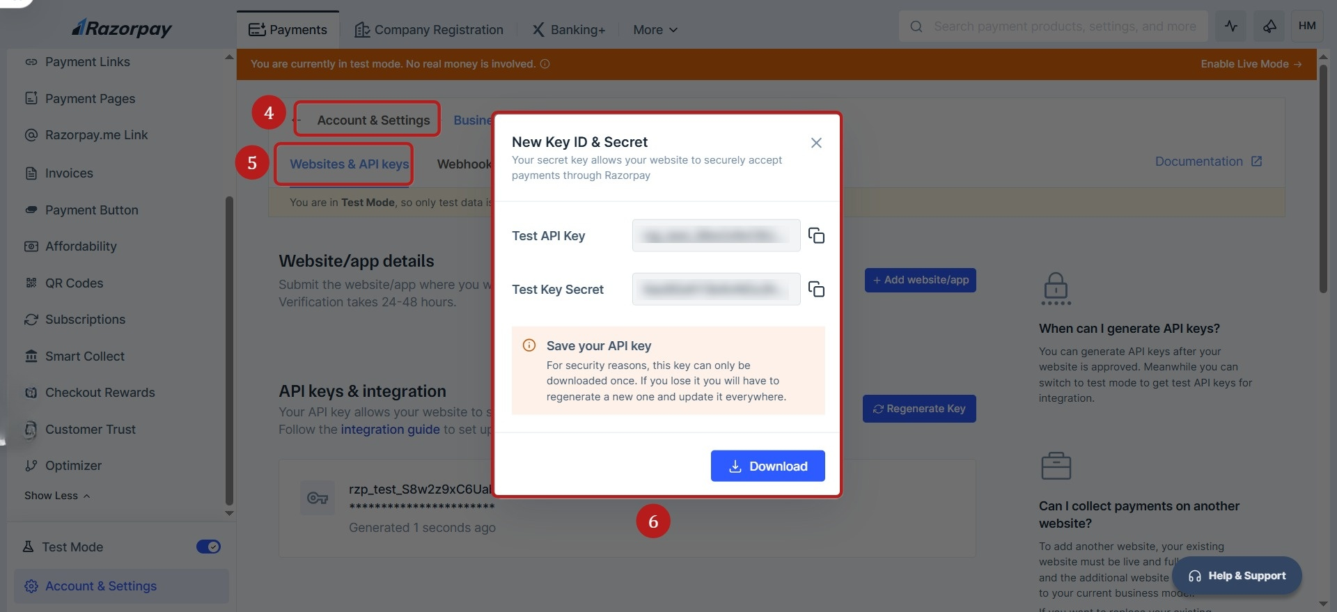 For at få API Keys ID/Secret fra din Razorpay-konto, log ind på din Razorpay-konto, gå til Settings (4) og derefter til API Keys (5).