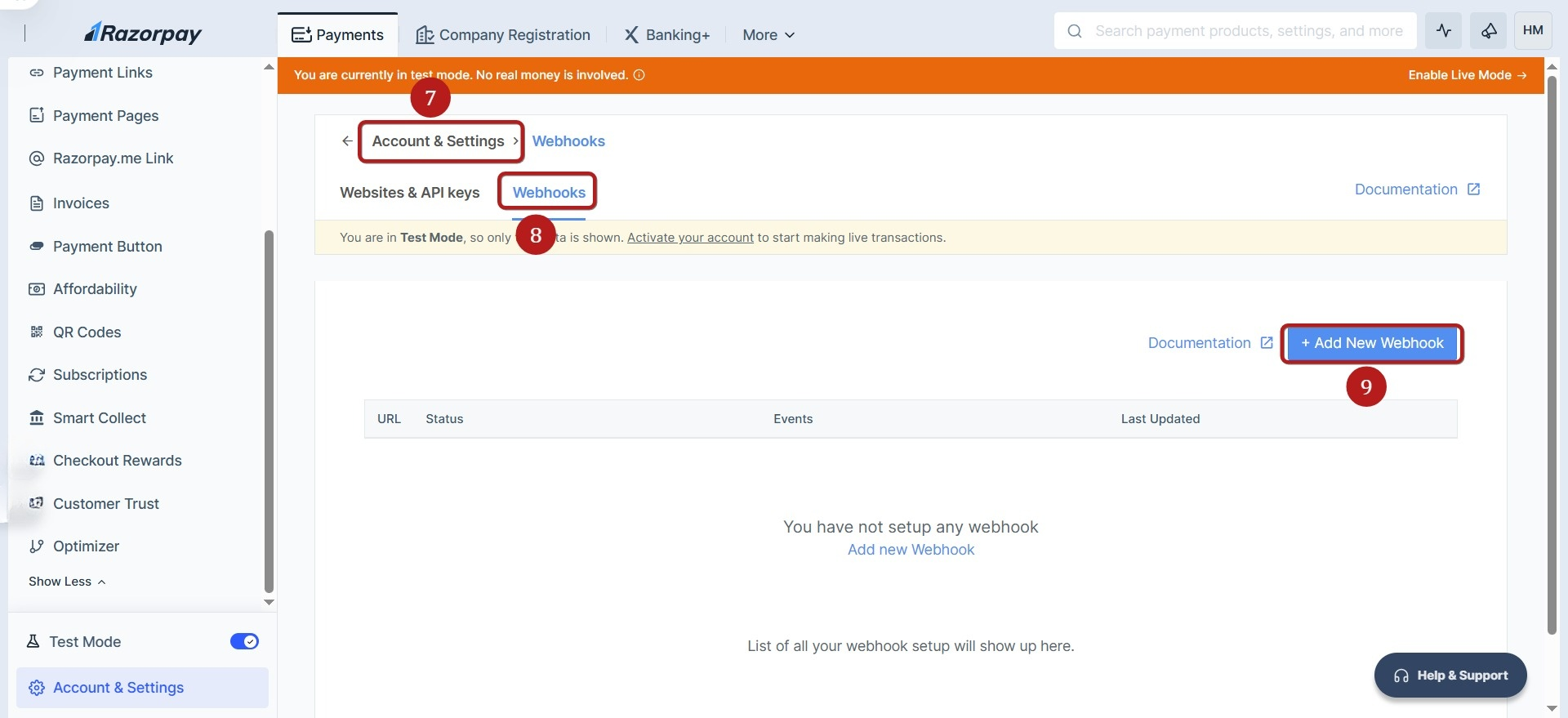 2. Klik på Settings (7), og fra din Razorpay-konto gå til Webhooks (8) og klik på Add new webhook (9).